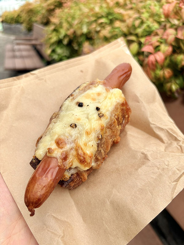 ホットドックはバゲットがザックザクで中のベシャメルソースがまろやか!薄皮パリパリで塩気の効いたソーセージといいバランス焼き立てで、ソースもまだ温かで焼き立て最高!!