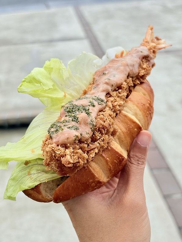 この日はすぐ食べる前提で入ったので、家へ持ち帰る前提の買い物では買えないものを選ぼう!と選んだのがおっきなエビフライの乗ったサンド!