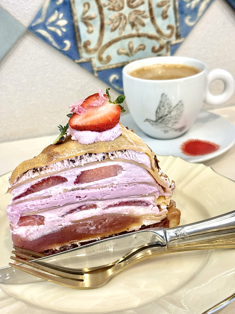 めっちゃうま〜…💖クレープはもちもち、桜のクリームたっぷりでミルフィーユ層になり、桜あんの甘塩っぱさとタルト生地もざっくりして美味しい!たまに味わえるいちごの甘酸っぱさも美味しく味わえる!ボリュームあって一個でお腹いっぱいな一品!